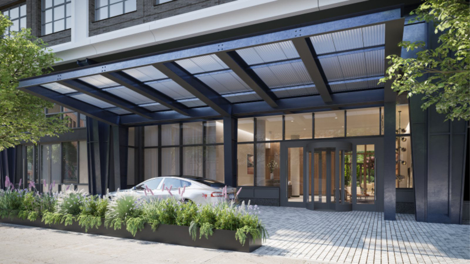 Occupying the sidewalk became a priority, and so a collection of entry canopies, landscape elements and a large ampersand sculpture dot the setback public plaza. These elements help the user occupy the space through the intimate scale. Move #6: The 4 residential entries are identified by expressive steel canopies made from a combination of built-up sections and standard ones. The gentle leaning of the angled geometry gives evidence to the hand-drawn quality of the design process. A custom glass frit will reference recycled corrugated glass often found in industrial buildings in the city. The light let through its gentle gradients will soften the intensity of the steel.