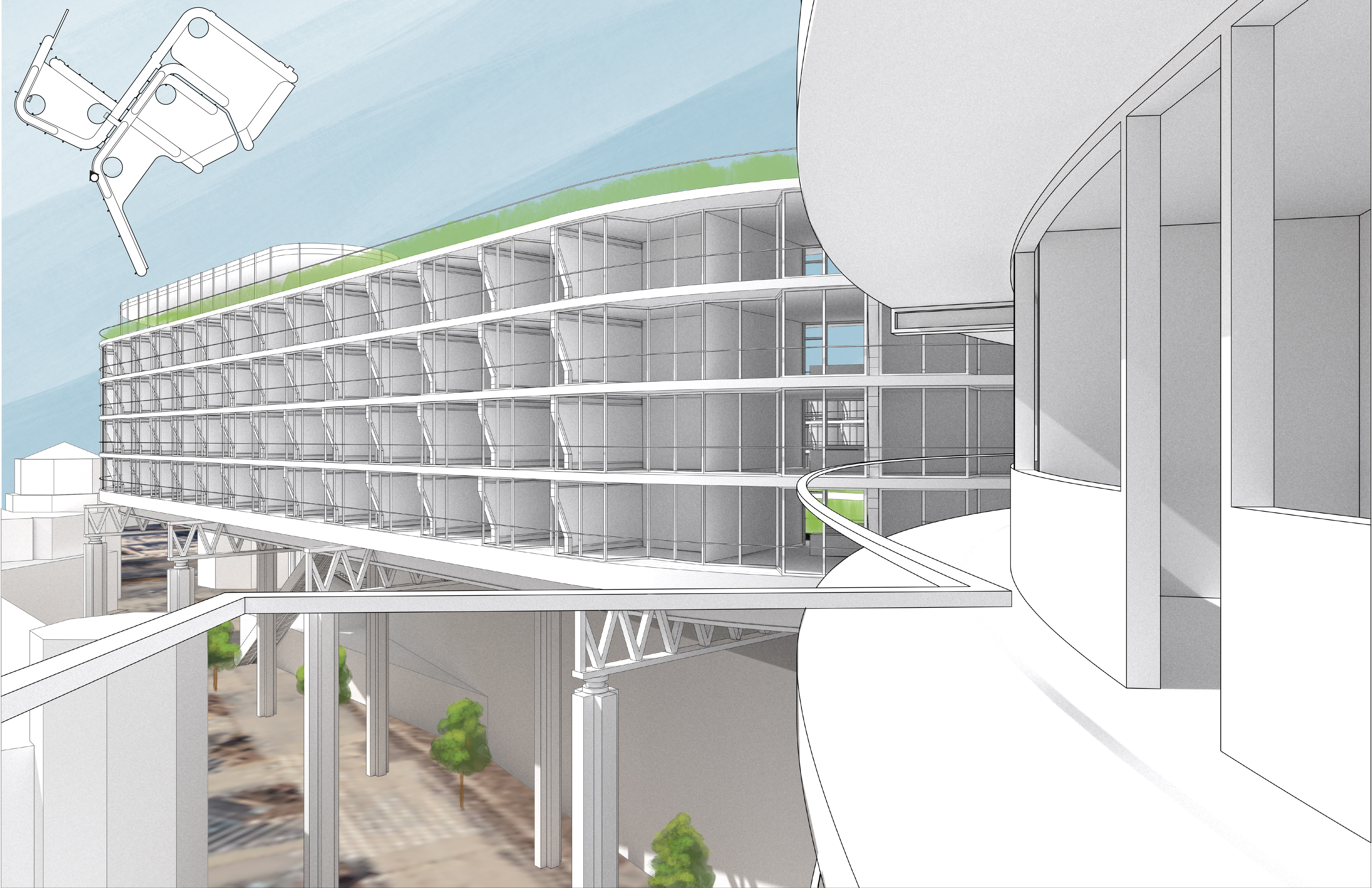 The strip mall is the greatest design opportunity in North American cities today. This project looks at densifying above the surface parking with an infrastructural housing typology.